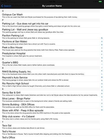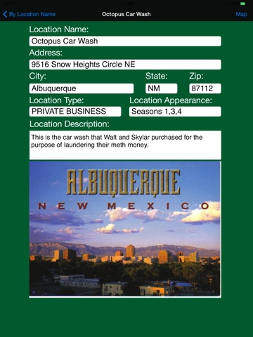 This is the Ultimate Breaking Bad TV Show Filming Location Finder Application for all fan enthusiast and tourist. Our application contains address information on over 80 Breaking Bad TV show filming locations in the surrounding areas of Albuquerque, New Mexico. At a touch of a finger, you can easily find Breaking Bad filming locations which includes houses, offices, parks, street corners, restaurants, private and public businesses in the city of Albuquerque, New Mexico.