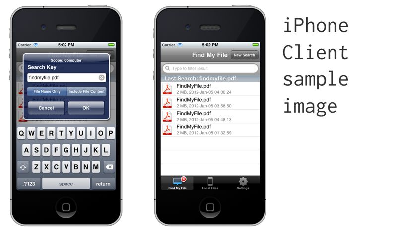 Server application for client iPhone or iPad to search file on Mac as easy as using Spotlight on Mac computer. File can be copied to iPhone/iPad.
