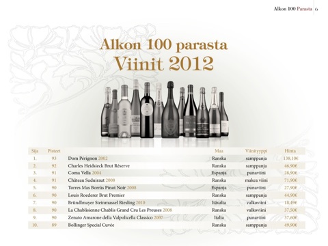 Olemme keränneet tähän oppaaseen ne viinit, jotka edustavat parhaimmistoa mitä Alko perusvalikoimallaan tällä hetkellä tarjoaa. Kirjasta löytyy myös laivayhtiöiden valikoimien parhaat viinit. Viinien ohella kirjassa on myös esitelty ne kotimaiset ravintolat, joissa olemme kokeneet viinien, hyvän palvelun sekä kauniin miljöön parissa unohtumattomia hetkiä.
