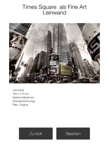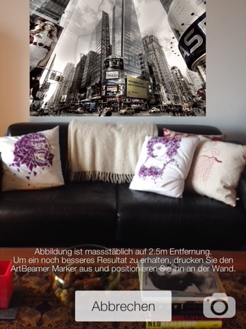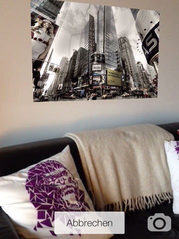 Der FineArtPrint.de-Beamer beflügelt die Vorstellungskraft. Die App macht ersichtlich, wie ein Bild sich in ihr bestehendes Intérieur oder ihre Wohnlandschaft einfügt. Sie erlaubt es darüber hinaus, Bilder zentimetergenau einzupassen: die App stellt alle Bilder massstäblich korrekt und exakt in der ausgewählten Grösse dar.