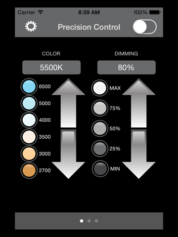Precision Control – mimics the wall control with buttons for preset levels and arrows for more granular settings.