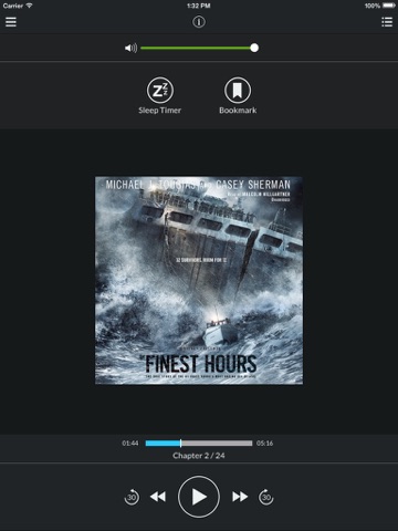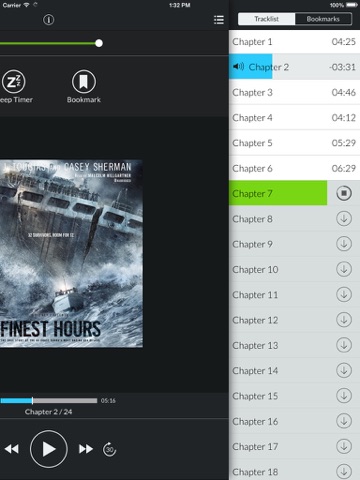 Download your book directly over Wi-Fi or cellular network and begin listening as soon as the first track downloads. The Downpour powered app features an attractive interface with traditional audio controls in addition to sleep timer, bookmarking, and variable track scrubbing.