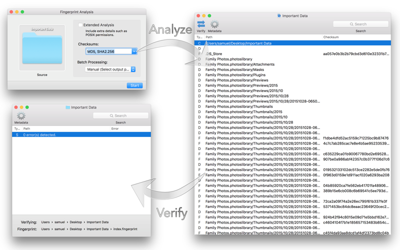 Fingerprint is a general purpose data integrity tool that uses cryptographic hashes to detect changes in files. Fingerprint scans a directory tree and generates a small transcript file containing the names and hashes of the files. This snapshot file can then be used to generate a list of files that have been created, deleted, or modified. If so much as a single bit in a single file in the directory tree has changed, Fingerprint will detect it.