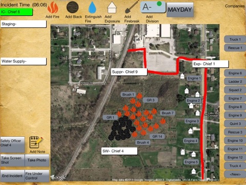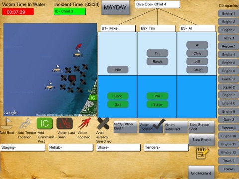 Other "behind the scenes" features include an UNDER ROOF TIMER, REHAB TIMER and an UNDER WATER TIMER, for divers. When you drop a company inside of a building, an internal timer starts. After the crew has been inside for 20 minutes, the timer will activate causing their icon to flash white and blue until they exit the building. When a crew has been sitting in rehab for 30 minutes, their icon will turn green, indicating that they should be ready to be recycled. As divers are under the water, their icon will turn green, yellow, then red the longer they are under. All these features packed into one simple app is making tactical worksheets obsolete!