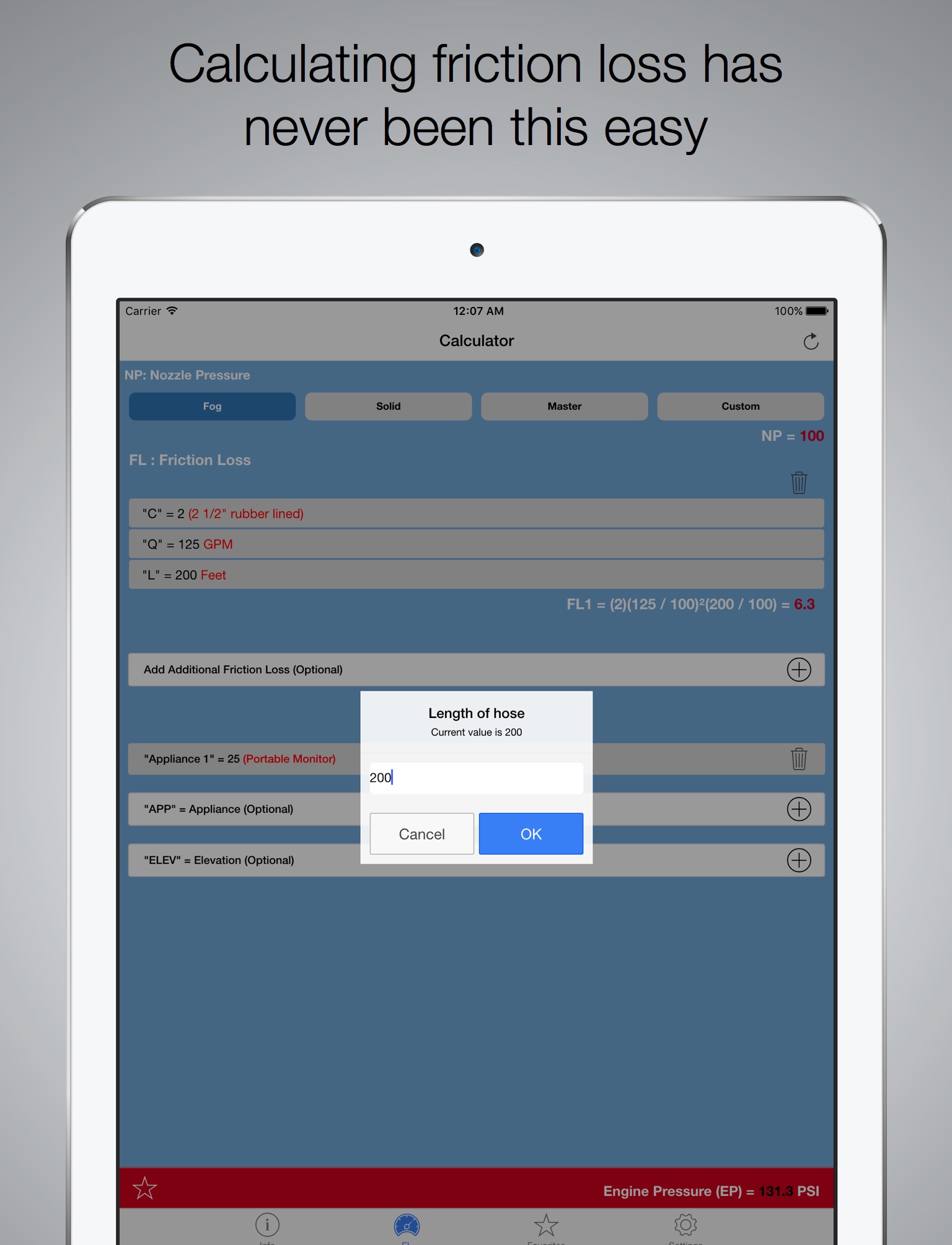 An application that will help you perform every pump operators basic equation. EP = NP + FL + APP + ELEV, you will be able to easily calculate the total Engine Pressure (EP) needed based on your inputs as well as: