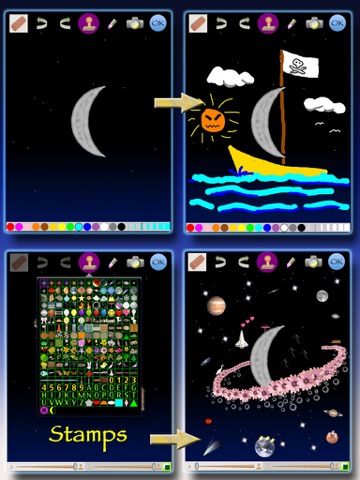 - Drawing Mode for more fun and more functions! (now with rubber-stamp tool (200+ stamps and 200+ stamp sound effects), snapshot and foreground/background layers)