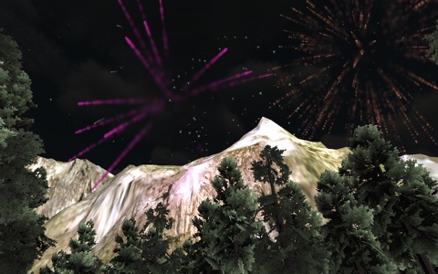 Enjoy full 3D immersion as you watch fireworks explode in a beautiful valley surrounded by trees and mountain peaks.