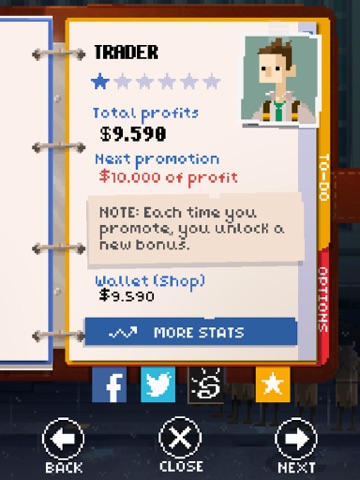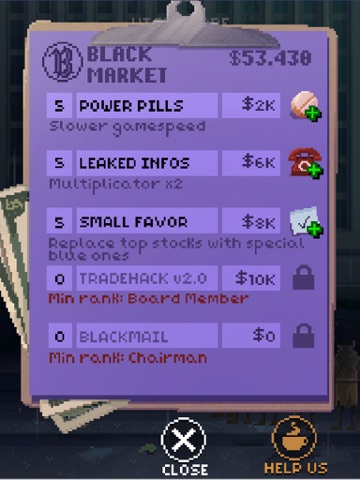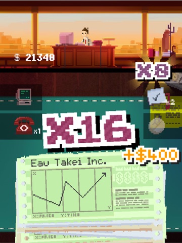 Les graphismes du jeu son certes "old school", mais on devient très rapidement adicte à ce jeu. Il y a différents niveaux de difficulté, et on travail les méninges tout en samusant et en gravissant les échelons du monde de la finance. En plus, le jeu nest pas très cher, donc cest un cocktail parfait, voué à se distraire et soccuper. À télécharger tout de suite !!!!!