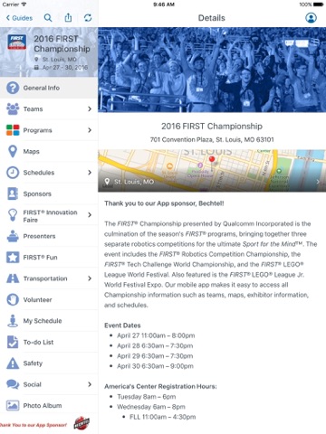 The FIRST® Championship sponsored by BAE Systems joins thousands of students for the ultimate celebration of STEM (science, technology, engineering, and math) and innovation. The event features FIRST® Robotics Competition, FIRST® Tech Challenge, FIRST® LEGO® League Challenge, and FIRST® LEGO® League Explore. Our mobile app makes it easy to access all FIRST Championship information such as teams, maps, exhibitor information, and schedules.