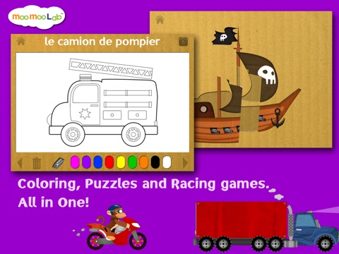 A collection of vehicles from a fire truck, a rocket, to airplane! All animated in this fun and interactive adventure. Not only can your child learn these vehicle names in different languages, he or she can also try 3 different fun activities to reinforce learning: Puzzles, Racing game and Coloring.