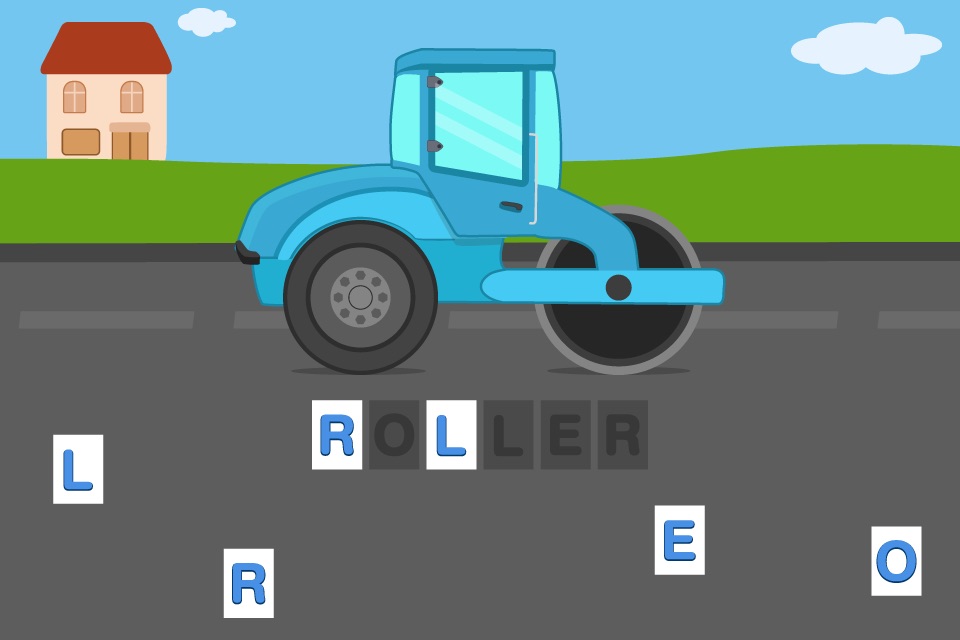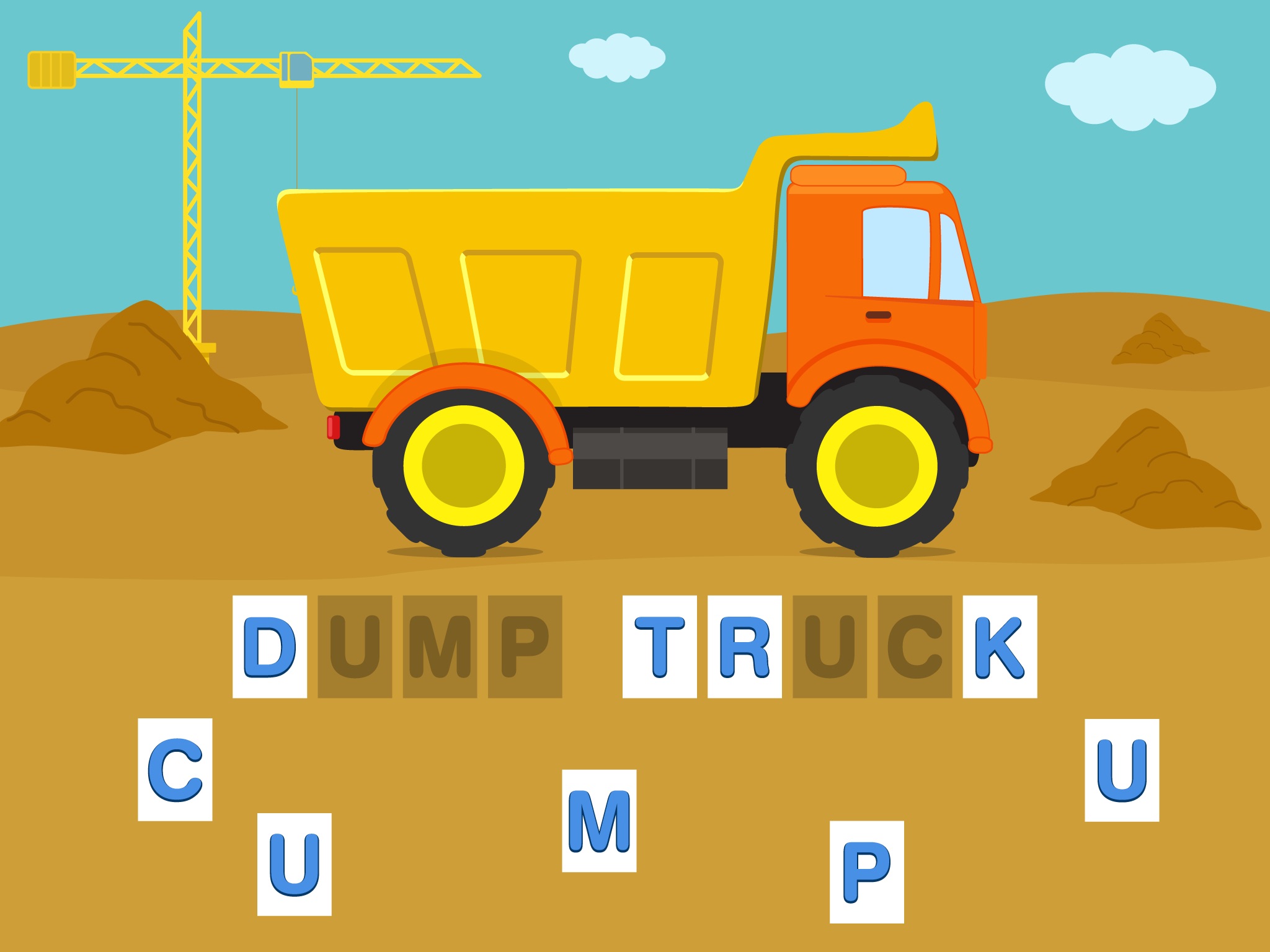 Kids Place the letter piece correctly on the puzzle shadow to hear the letter name, when the word is complete the word and sound of the vehicle - dump truck, loader, cement truck, fire truck, forklift, helicopter, taxi, school bus and much more!