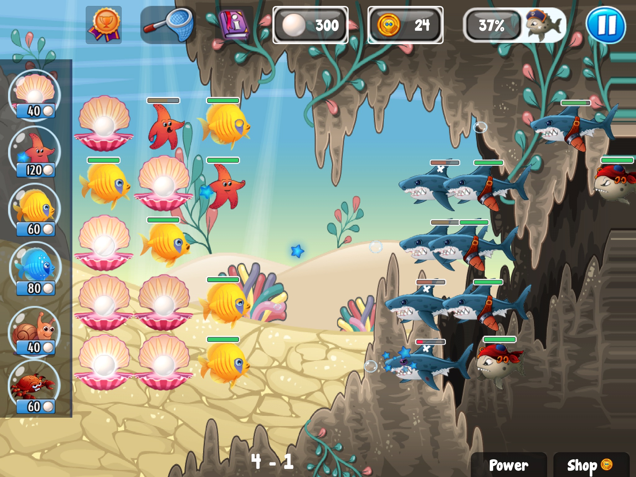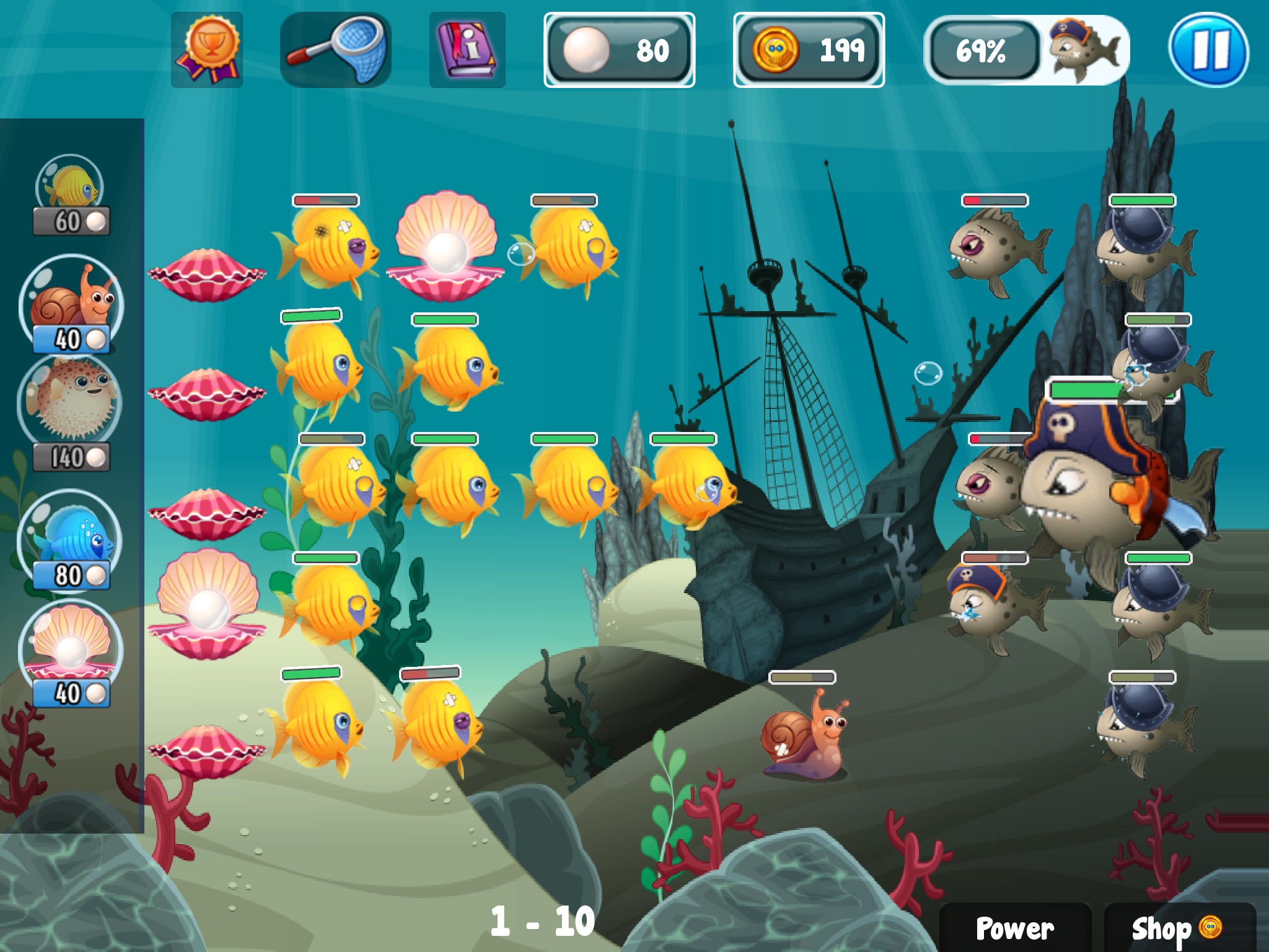 Place different types of fish to fight against sneaky pirates. Use oysters to produce pearls which you need to get more fishes.