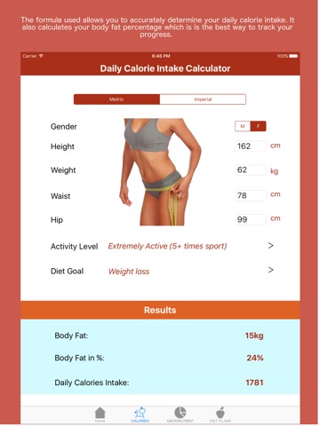 -Daily Calories Intake Calculator: can be used to estimate the calories you need to consume each day depending on your goals (weight gain, weight loss or maintain your current weight). The formula used here allows you to calculate approximately your body fat percentage.
