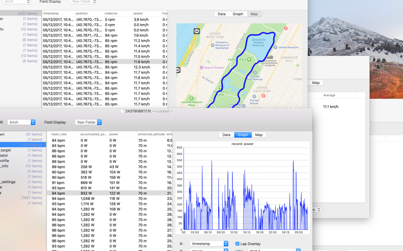 For fields that contains many entries (record, laps, etc) it will also display graphs of the data from the last column the user clicked on.