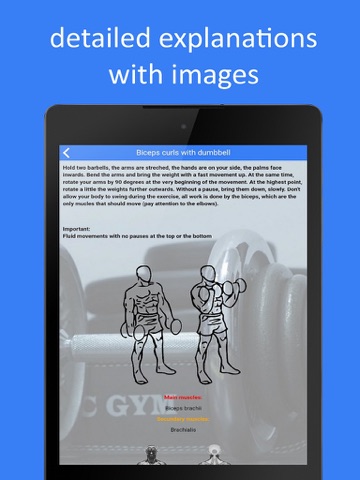 With the fitness guide you have all fitness exercises in your pocket. You can access all exercises easily and clearly. All fitness exercises all sorted by muscle groups and are explained detailed by a description text and images.