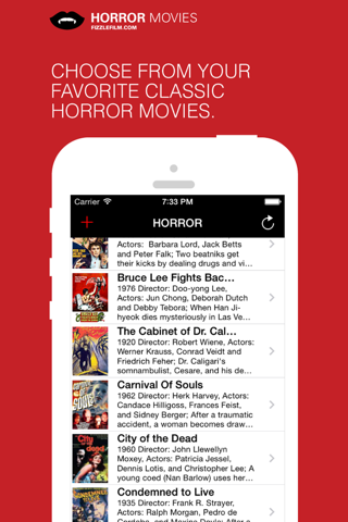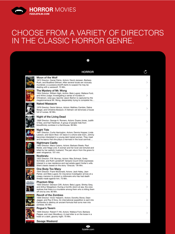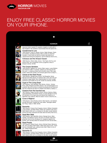 A huge trove of full length Classic Horror movies that stream directly to your iPhone, iPod, and iPad. These horror flicks are now at your fingertips, streaming over your cellular network and Wi-Fi. This app is sure to be a favorite with some of the most desirable actors, actresses, and directors of the last century. Also, these films are from fizzlefilms horror genre and we add films periodically without you having to update — its automatic, just refresh the app and enjoy!