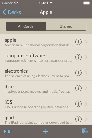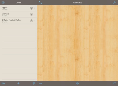 With Flashcards you can create your own decks of cards you need to study or import existing decks from Quizlet.com. You have access to all public decks on quizlet.com and you can also login into your account and import your own decks (All changes you make to your decks imported to Flashcards will not affect your online decks).