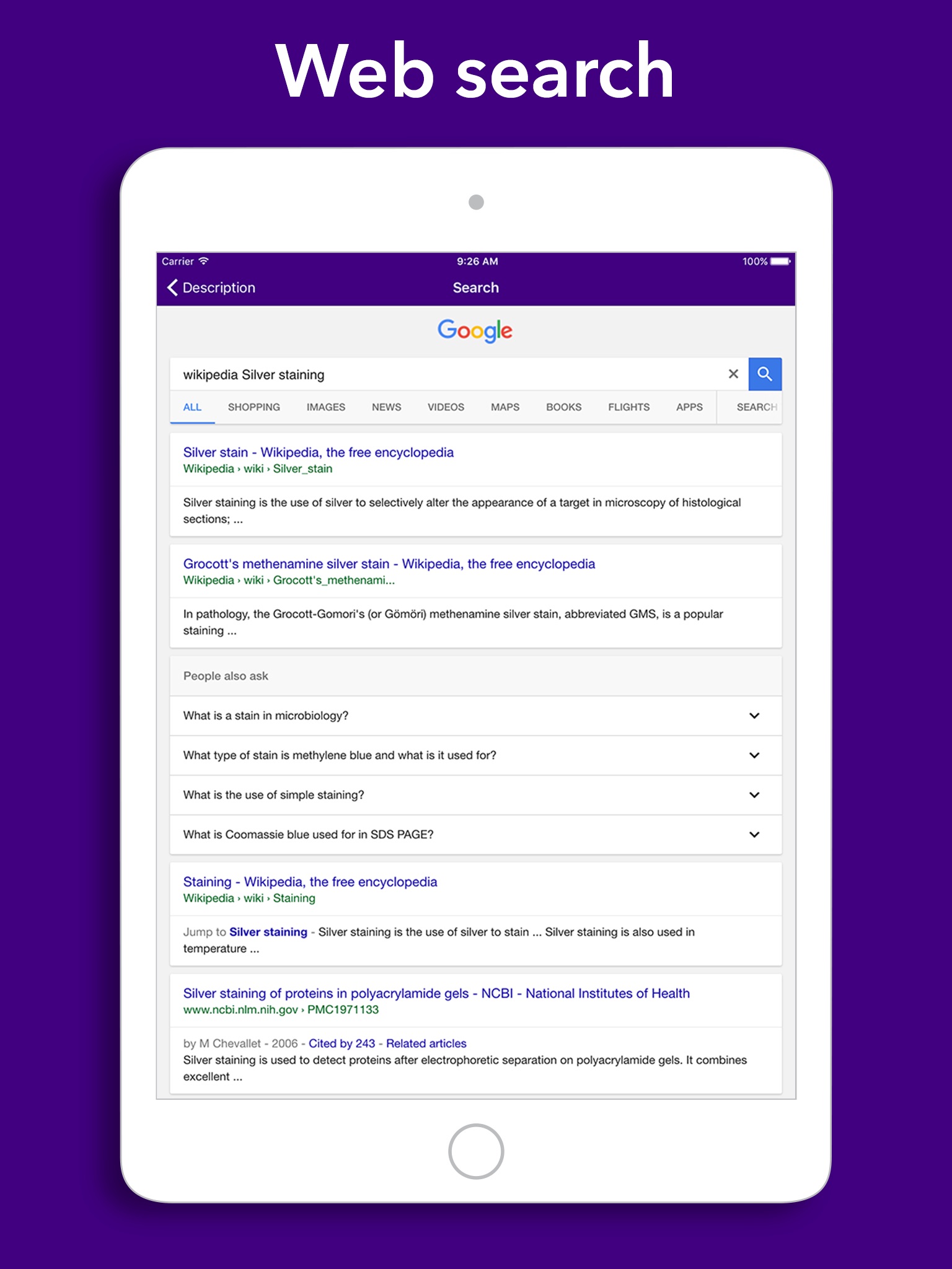 This app contains 21 Histology Stain Flashcards that are randomly presented, allowing you to both learn and test your knowledge of histological staining methods.