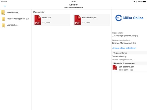 Om deze app te gebruiken heeft u de inloggegevens nodig van het klantenportaal van uw accountants- of administratiekantoor. Vraag uw relatiebeheerder of zij u dit ook aanbieden. Na het invoeren van uw inloggegevens en eventueel een SMS-code, kiest u een persoonlijke PIN-code om in het vervolg op de app in te loggen of gebruikt u TouchID (uw vingerafdruk). Zo blijven de gegevens in de app altijd veilig bewaard en zijn ze toch gemakkelijk te bereiken. Als u bent ingelogd en u heeft toegang tot meerdere entiteiten (bijvoorbeeld bedrijven), dan kunt u direct bij alle functionaliteit voor deze entiteiten.