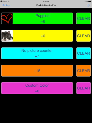 Powerful customizable counter. Supports 1 through 12 counters with user-selected images, label text, and custom colors; 15 click sounds or none; optional minus and clear buttons; reverse plus/minus; 0.01-100 units per touch; all configurable per counter. Cascading counters. Save and load 15 layouts and totals; email counts; works in either orientation.