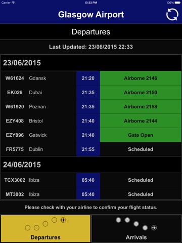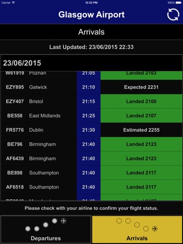 Displays current Departures and Arrivals at Glasgow Airport (GLA)