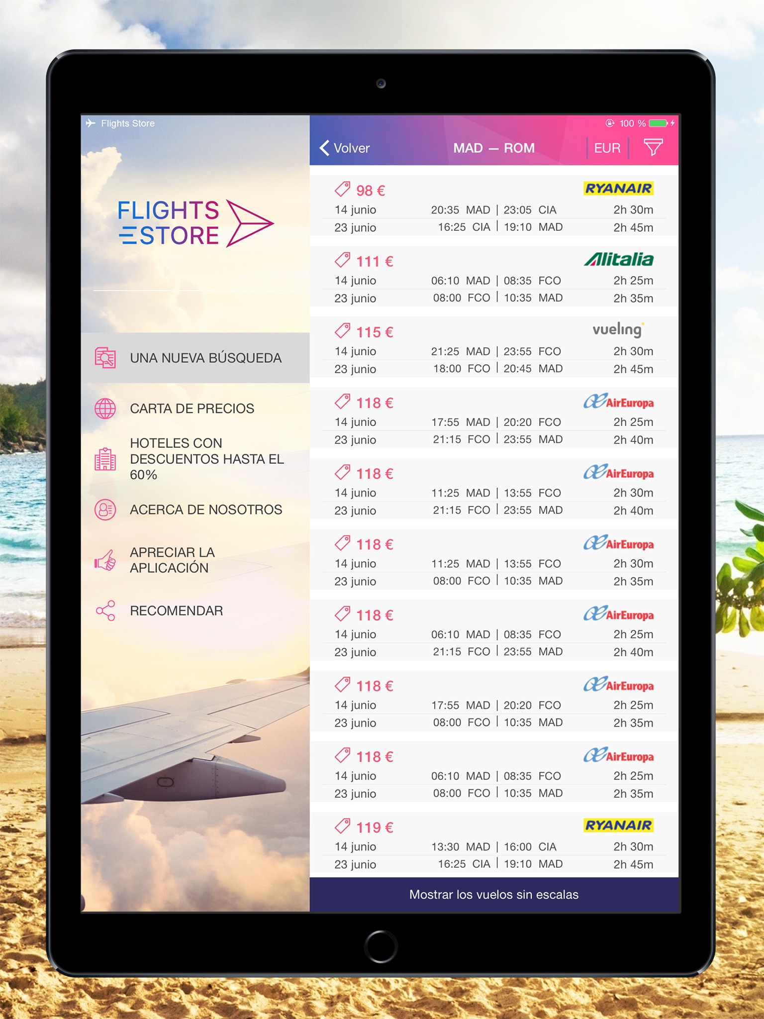 It’s very simple to use Flights Store: just install the app, select the flight direction and flight date and sort the results according to the filters.