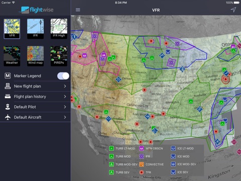 FlightPlanner has both VFR and IFR Enroute (low-altitude and high-altitude) charts, and allows overlays with aviation-specific conditions, including AIRMETs, SIGMETs, PIREPs, TFRs, and echo tops. It also includes general-purpose weather radar and wind speed maps.