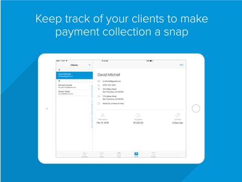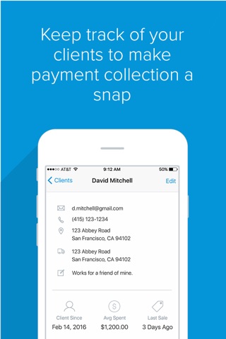 Flint enables you to get paid instantly via invoice, on a website, in a mobile app or on social media. Send free mobile invoices right from the app. Your customers get an email with a “Pay Now” button that opens a secure web page where they enter their credit card info and complete payment in seconds. Flint automatically follows up with customers if they haven’t paid by the due date so you don’t have to.