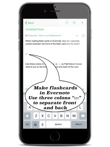 * Flash cards made in Evernote must contain a sequence of three colons (":::") so FlipForever knows what content to show on each side of the flash card.