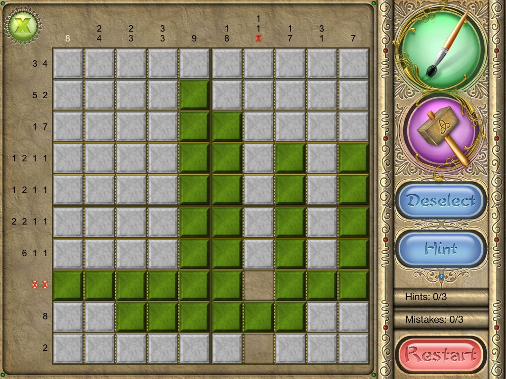 An old Japanese logic puzzle takes on a new look with FlipPix Art! Touch tiles to paint them or break them to form colorful components of paintings. The goal is to use logic to determine which tiles should be filled to reveal a hidden picture.