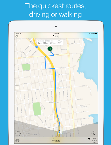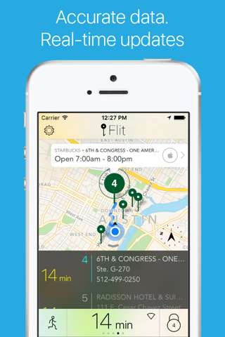 Open Flit and instantly find the nearest Starbucks stores along with detailed routes and travel times.