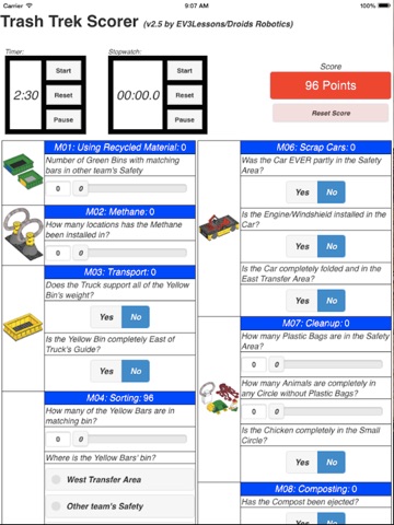 This is an electronic Trash Trek scorer. Use this app to track your score throughout FLL season. This scorer also has a timer and stopwatch. It will be updated as the rules for the challenge get updated. You can save your score and the app will generate a line graph using the data.