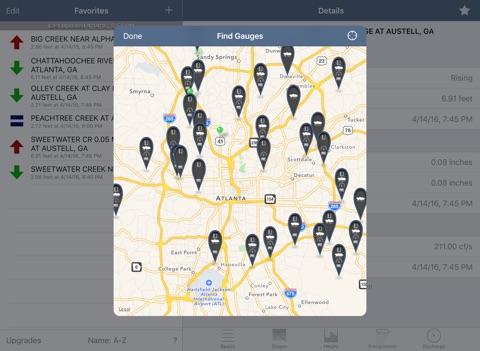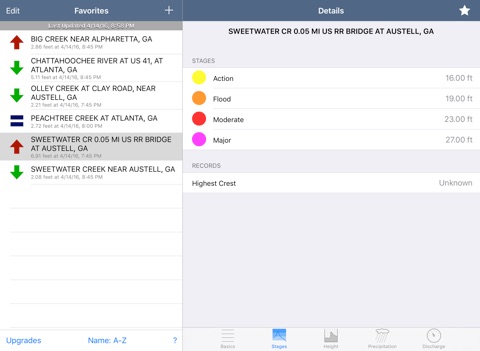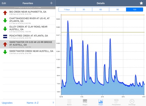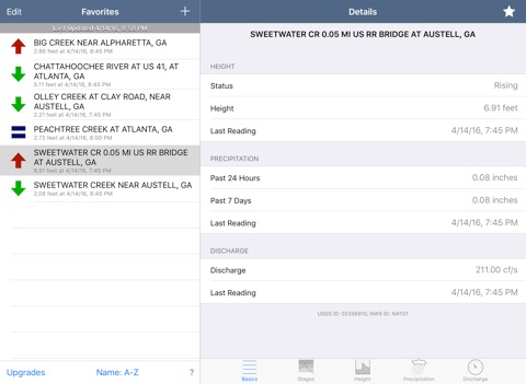 FloodWatch allows users to monitor rivers and streams throughout the United States. Add USGS gages to your favorites for quick monitoring of current gauge height, precipitation, and flood stage.