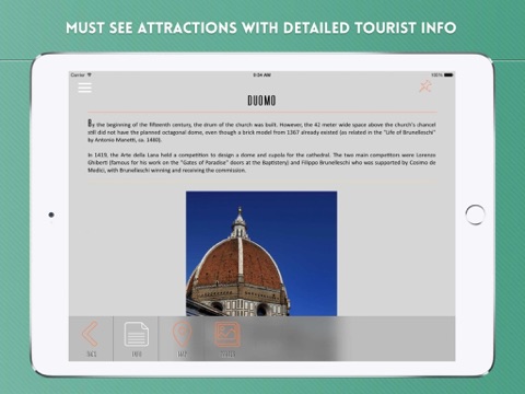 AUGMENTED REALITY, unlike other tourist guides you will be able to discover the city with the best iPhone and iPad tool - AR - Just click on the AR button, turn yourself 360° and view on the screen where the best spots are and how to find them. You can also scroll up and down to view the closest and furthest attraction.
