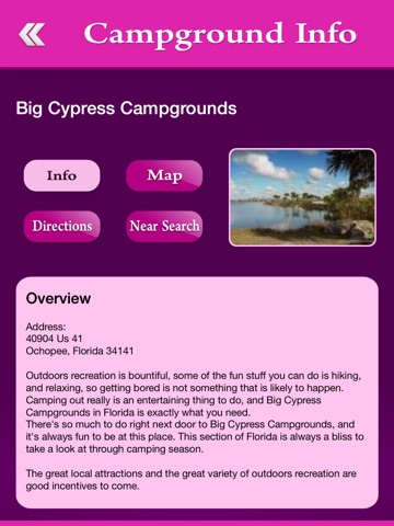 Campground Info # Amenities # Address # Description # Map # Directions # Pictures # Near Search # Route Map