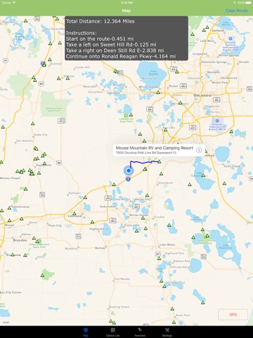 Find Directions from your current location to any campsite or Search Custom Route directions between any two desired locations on map.