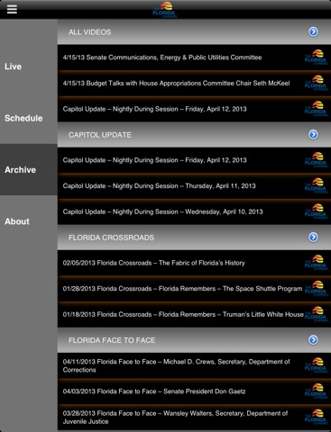 View a schedule of events and see updates in real-time. Watch LIVE events, gavel-to-gavel. Get access to TheFloridaChannel.org’s complete video archive, including programs like Capitol Update, Florida Face to Face, Florida Crossroads and News Brief.