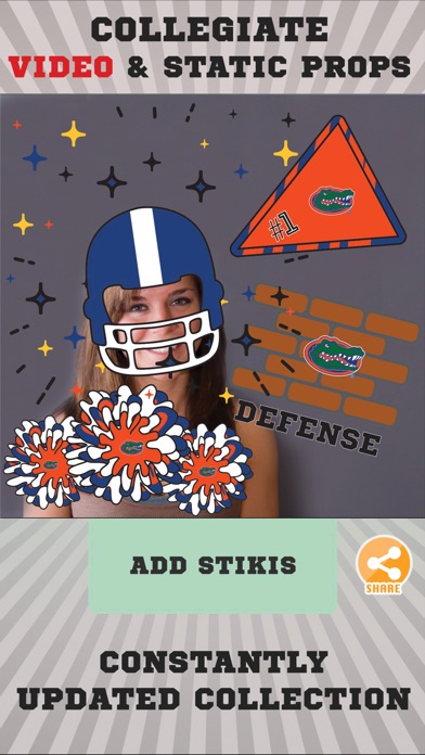 Florida Gators Animated Selfie Stickers app lets you add awesome, officially licensed Florida Gators animated and graphic stickers to your selfies and other images OR VIDEOS. You can add a variety Florida Gators animated stickers such as Florida Gators Defense, Interception, Touchdown, Cheering Fan and more. You can also add graphic stickers such as branded glasses, hats, shirts, foam fingers, hair, helmets and much more. Afterwards, share them with your friends through email, messaging, Instagram, Facebook, and Twitter. Or save them to your photo gallery for future use. Become the Florida Gators fan you were meant to be!!!