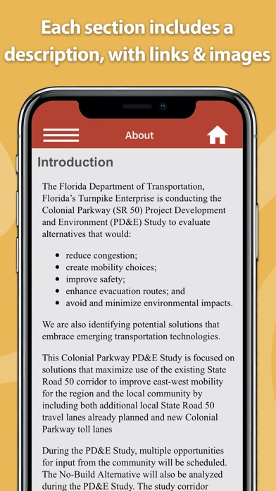 The Florida’s Turnpike Projects app provides a summary of the current major projects being developed by Florida’s Turnpike Enterprise. Each project summary will include: