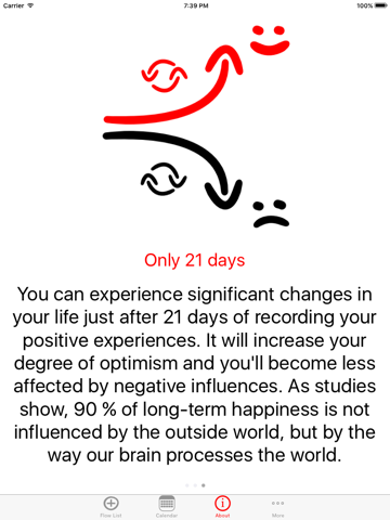 As studies shows, 90 % of long-term happiness is not influenced by the outside world, but by the way our brain processes the world. This application can help you to train optimistic thinking. A simple method lies in recording thee positive experiences that pleased your throughout the day. With this tool, you’ll begin to systematically build optimistic thinking and your life satisfaction will increase. Current scientific research shows optimism and pessimism are not innate, but learnable attitudes. If a person learns to be an optimist, his brain works much better, increasing its creativity, intellect and energy, all thanks to his positive attitude. You can experience significant changes in your life just after 21 days of recording your positive experiences. It will increase your degree of optimism and you’ll become less affected by negative influences.