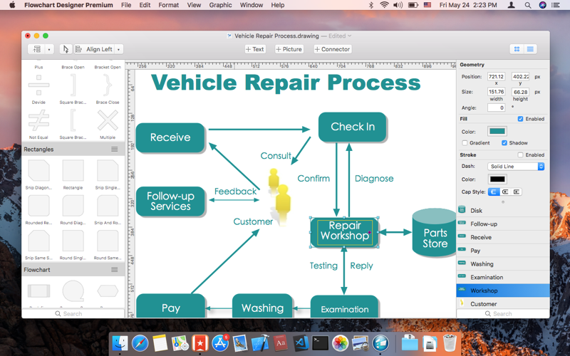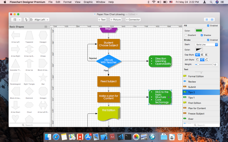 Flowchart Designer Premium is a lightweight flowchart editor. With lots of preset shapes and the smart connector, you can create a flowchart easily. And, if you like, you can use it to create other diagrams, such as illustration diagrams, mind maps, and so on.