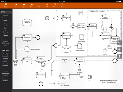 The app is designed with ease of use in mind. You can quickly connect flowchart shapes by simply selecting the start and end connection points and quickly add new lanes to a swimlane diagram or new sub-topics to a mind map diagram by using "+" button from the selected swimlane or mind map shape menu. The mind map sub-topics are automatically positioned on the page but can be easily moved as required.
