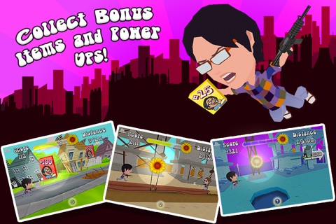 • Tap the bottom center of the screen to use a temporary invincibility power-up. This protects you for a limited time from spikes, pits, toxic waste & bullets. Watch out though, falling in pits or between buildings means instance death!