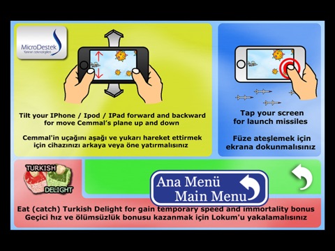 Tilt your IPhone / Ipod / IPad forward and backward for move Cemmal’s plane up and down.