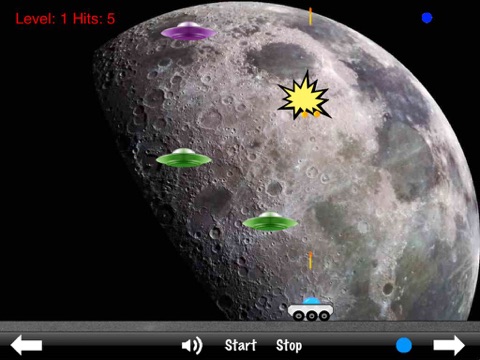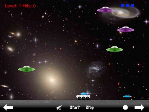 Defend the earth against alien invaders from outer space. Alien Flying Saucers shoot across the sky and it is up to you to shoot them down. You are armed with missiles and a very fast truck. Flying saucers will drop bombs and shoot rockets at you, so you will have to be fast. Shoot down 50 Flying Saucers to move to the next level. Flying Saucers will get faster and drop bombs more quickly as the levels increase.