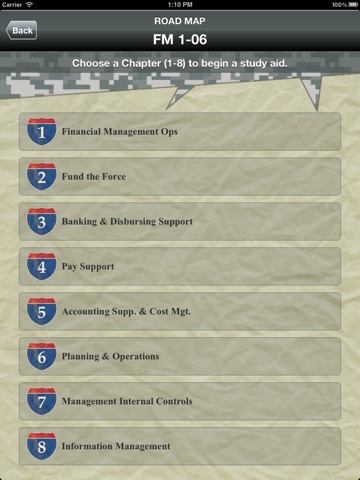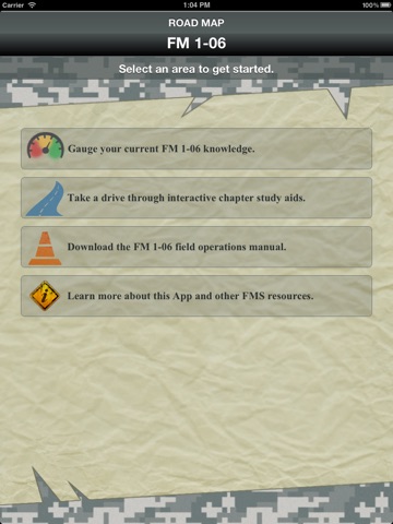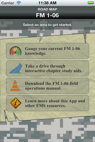 The FM 1-06 Road Map App is an Army-developed app that supports the Financial Management School at Fort Jackson, SC. The App provides soldiers with an interactive study guide that tests their knowledge of the field manual. It includes a pre-assessment, learning games, and pop quizzes.