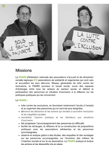 La Fédération des acteurs de la solidarité regroupe 870 associations de solidarité et organismes qui vont vers et accueillent les plus démunis. Réseau généraliste de lutte contre les exclusions, la Fédération des acteurs de la solidarité promeut le travail social, ouvre des espaces déchanges entre tous les acteurs du secteur social, et défend la participation des personnes en situation d’exclusion à la réflexion sur les politiques publiques qui les concernent.