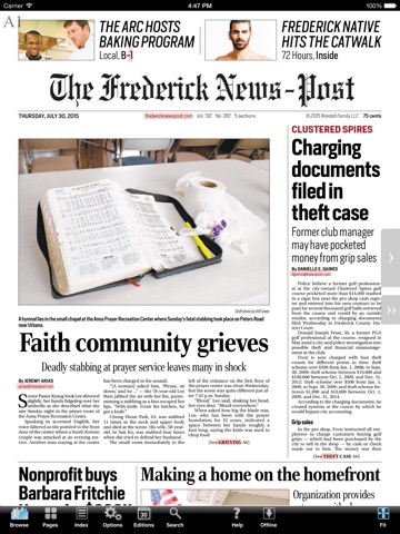The Frederick News-Post ePages lets you read The Frederick News-Post on your iOS device just as it appears in print. You can flip through pages and skim headlines as you would the printed edition. But better than that, the FNP ePages allows you to enlarge type with the tap of a finger, or jump instantly to the conclusion of a story on another page. You can link to websites mentioned in stories with a single touch, or fire off an e-mail to an address linked from the newspaper. And if you missed the paper one day, dont worry. The FNP ePages lets you download past editions, too.