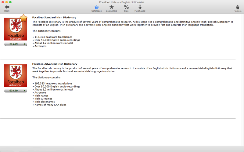 Irish-English and English-Irish dictionaries available for in-app purchase