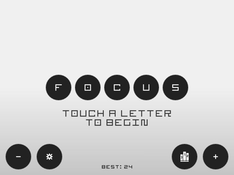 Focus is a game of simplicity, concentration, and endurance. To play, choose a letter from the word on the screen. Each round the letters shuffle and you try to pick your letter. As the game progresses, rounds become longer and faster, requiring greater and greater focus! How fast are your eyes? Do you have what it takes to achieve Perfect Focus?